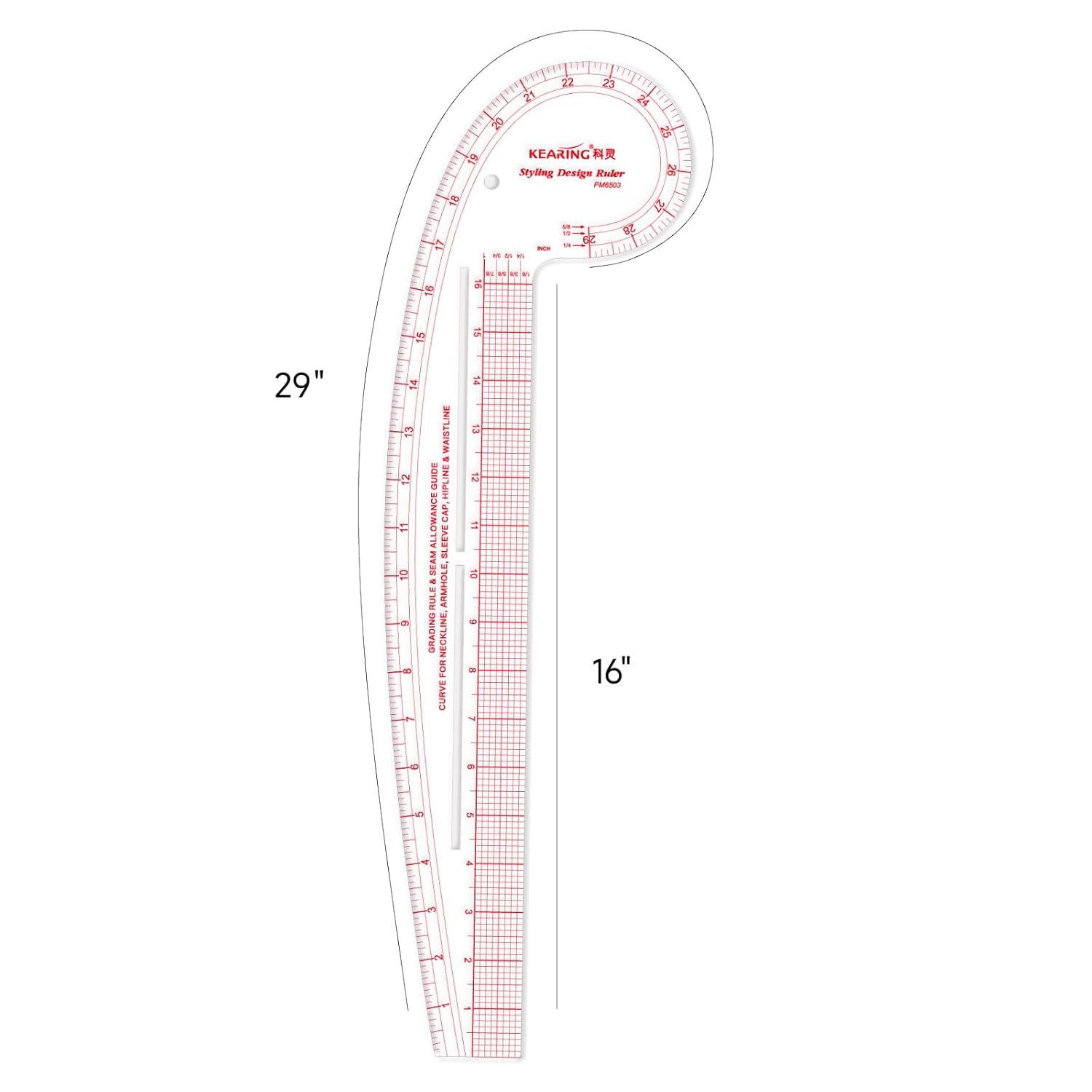 4 Rulers in 1: French curve, Hip curve, Straight ruler and Cut-out slots. 29" French Curve line size & 16" Straight ruler size,